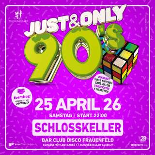 Die JUST & ONLY 90’s bringt am Samstag, 25. April 2026 die ganze Magie der kultigen Neunziger zurück in den Schlosskeller Frauenfeld! 💜✨