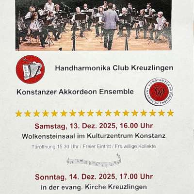 Auch dieses Jahr präsentieren der Handharmonika Club Kreuzlingen und das Konstanzer Akkordeon Ensemble unter der Leitung von Dorin Grama ein vielseitiges Musikprogramm. Nebst modernen und traditionellen Advents- und Weihnachtsmelodien werden auch bekannte Melodien aus Rock und Pop präsentiert. Beide Vereine laden alle Musikfreunde ganz herzlich ein den 3. Advent feierlich ausklingen zu lassen.