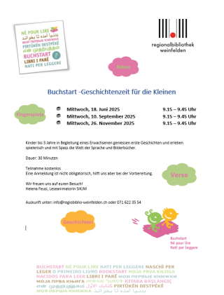 Kinder bis 3 Jahre in Begleitung eines Erwachsenen geniessen erste Geschichten und erleben spielerisch und mit Spass die Welt der Sprache und Bilderbücher.