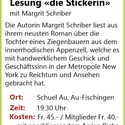 Margrit Schriber liest aus ihrem neusten Roman über die Tochter eines Ziegenbauern aus dem innerrhodischen Appenzell, welche es mit handwerklichem Geschick und Geschäftssinn in der Metropole New York zu Reichtum und Ansehen gebracht hat.