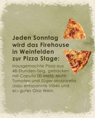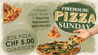 Ab sofort wird der Sonntag im Firehouse zum Pizza-Tag: Von 16:00 bis 21:30 Uhr dreht sich alles um unsere Pizza aus dem original italienischen Steinofen – mit Teig, der 48 Stunden reift, Caputo 00 Mehl, Mutti-Tomaten und Züger-Mozzarella.