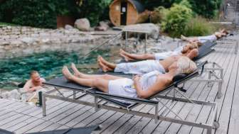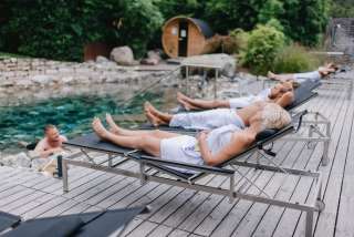 In der Wellnessoase in einer der verschiedenen Saunen, im Dampfbad, im Ruheraum oder auf der Liegeterrasse kann entspannt werden.