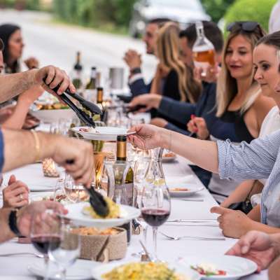 Die Tavolata findet einmal im Monat über das gesamte Jahr hinweg statt. Bei schönem Wetter draussen unter den Arkaden | bei kühlem Wetter, drinnen in der Vinothek.