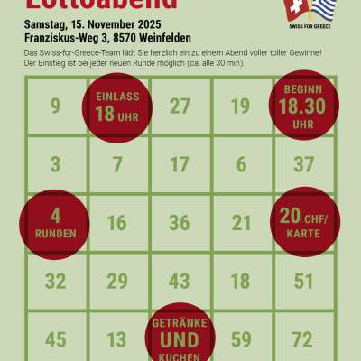 Am Samstag, 15. November 2025 lädt das Team von «Swiss for Greece» herzlich zu einem gemütlichen Lottoabend ein. Gemeinsam spielen, tolle Gewinne ergattern und dabei ein Hilfsprojekt unterstützen – all das erwartet Sie im Franziskus-Weg 3 in Weinfelden.