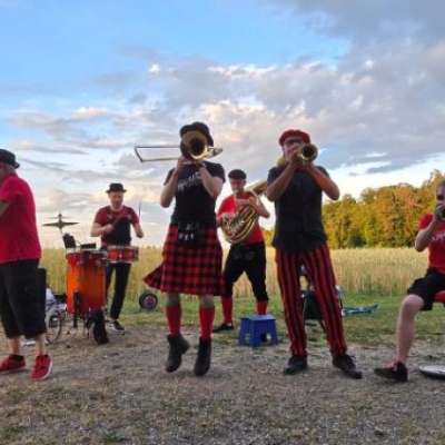 Vor einem Cocktail Drum Kit bauen sich zwei Trompeten, eine Posaune, ein Tenorsax und ein Helikon für Spielfreude gepaart mit Lust am Musizieren auf.