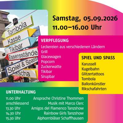 Freu dich auf eine lebendige Begegnung der Kulturen mit Köstlichkeiten aus der Welt unserer Mitarbeitenden, stimmungsvoller Musik und mitreissenden Tanzshows. Geniesse besondere Momente bei Rikschafahrten oder entdecke das vielfältige Kinderprogramm mit Karussell, Glitzertattoos, Ballonkünstler und weiteren Überraschungen.