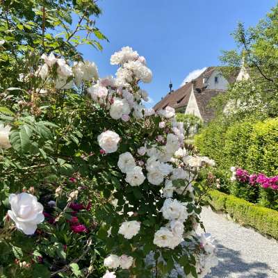 Die Rosenpracht gehört in den Sommermonaten zum Markenzeichen der Kartause Ittingen. Jedes Jahr, zur Blütezeit, steht die Sonntagsführung im Zeichen der Rosen. Der Rundgang führt zu den augenfälligen Rosenpflanzen, aber auch zu Rosen, die bewusst an verborgenen Orten angepflanzt wurden. Auch symbolisch ist die Pflanze zum Beispiel in der Kirche oder in der Mönchszelle zu finden. Wer mehr zum Bepflanzungskonzept, zur Herkunft der Rosen oder zur Symbolik der Blume wissen möchte, erfährt dies auf dem Rundgang in den Gärten des Klosters und auf der Anlage.
