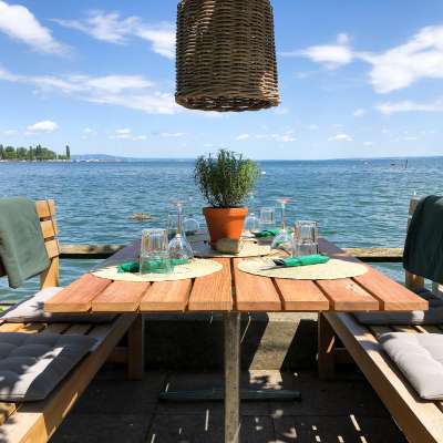 Zu entdecken gibt es natürlich auch andere Gerichte auf der ausgewogenen Speisekarte. Sehr empfehlenswert ist jeweils der aktuelle Tagesfang. Im gemütlichen Restaurant mit Seeblick lässt es sich herrlich entspannen: Ob in der Seemannsstube, auf der grossen Terrasse unter schattenspendendem Blätterdach oder in der Liegelandschaft auf der Selbstbedienungswiese.