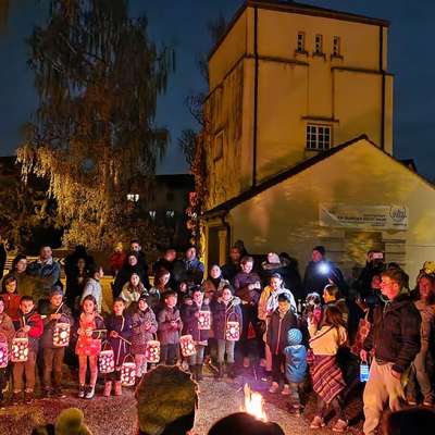 Räbeliechtliumzug des Kindergartens Eschengut und der 1. Primarschulklasse Alpenblick. Auf dem Niklausenplatz hält der QV für die Kinder Speis und Trank bereit.