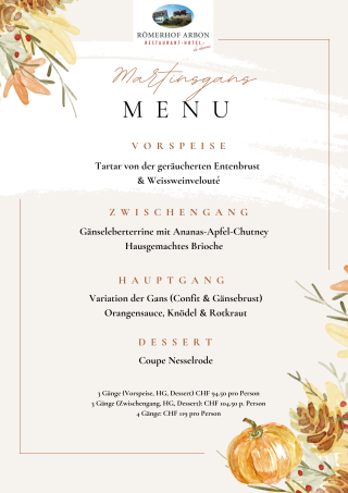 Vom 11. bis 15. November bietet der Römerhof ein festliches 4-Gang-Menü rund um Gans und Ente an. Mittags wie abends lädt die herbstliche Kulinarik in stimmungsvoller Atmosphäre zum Geniessen ein.
