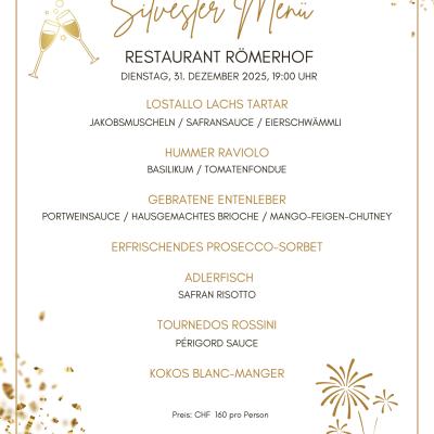 Feiern Sie den Jahreswechsel im eleganten Ambiente des Römerhof Arbon und lassen Sie sich kulinarisch verwöhnen. Am 31. Dezember 2025 erwartet die Gäste ein exklusives Silvester-Galamenü mit raffinierten Gängen, hochwertigen Zutaten und ausgewählten Weinen. Das festlich dekorierte Restaurant bietet den passenden Rahmen für einen genussvollen Abend – ob in kleiner Runde oder in grösserer Gesellschaft. Ein stilvoller Jahresausklang mit kulinarischem Höhepunkt, der in schöner Erinnerung bleibt.