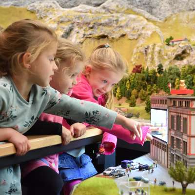 Modellbahn-Fans und Familien. Im Massstab 1:87 sind Meilensteine der Schweiz in Landschaften mit Gebäuden, Wagen, Gleisen und Figuren dargestellt.
