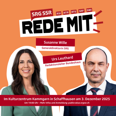 In der ganzen Schweiz diskutieren bekannte Gesichter der SRG sowie Journalist:innen von SRF, RTS, RSI und RTR mit euch über Medien, Gesellschaft und die Rolle der SRG für den Zusammenhalt.