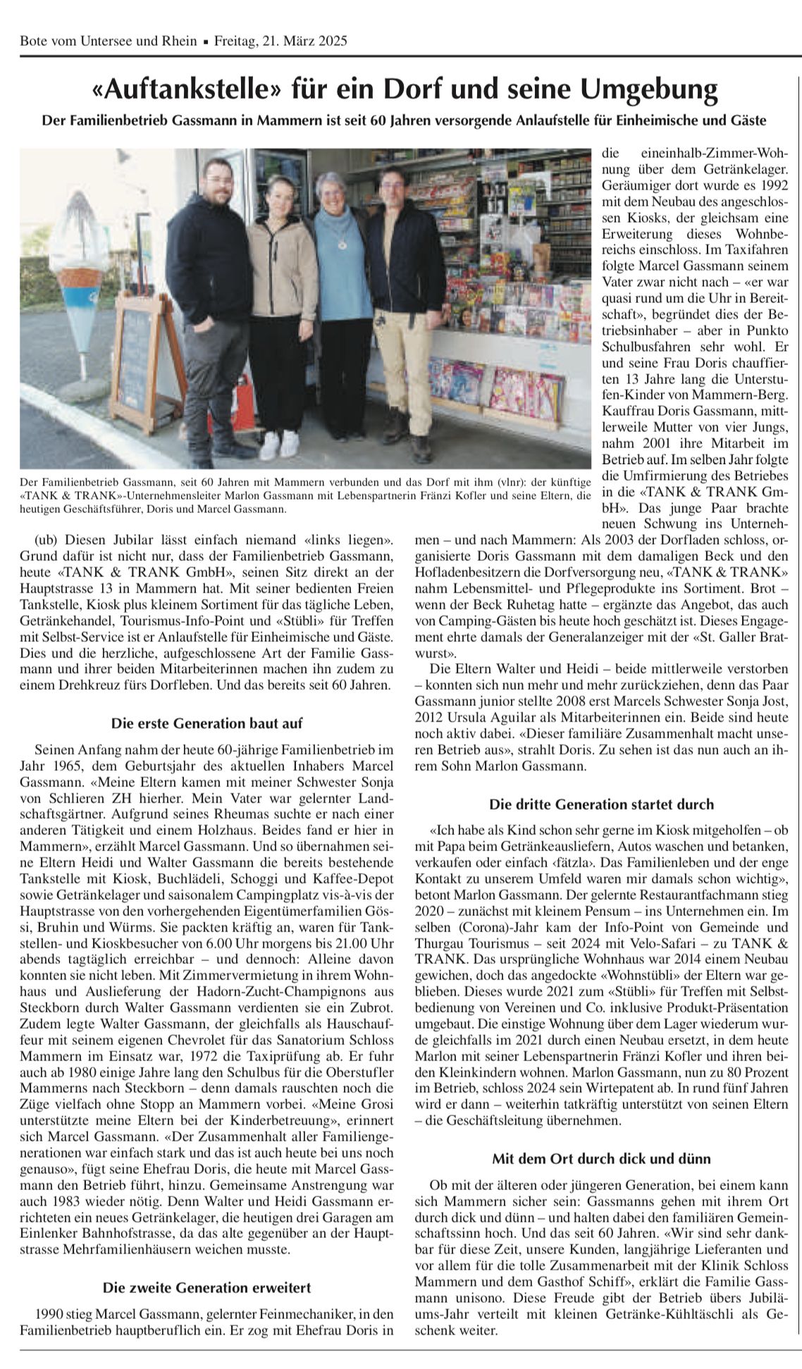 Tank & Trank in Mammern am Bodensee ist ein reich bestückter Tankstellenshop der besonderen Art. Neben einem breiten Sortiment an täglichen Gebrauchsartikeln, Getränken und Lebensmitteln finden sich hier auch Leckereien aus der Region wie täglich frisches Brot vom Beck, die zarten Caramelhäppli «Mürbel» oder der fruchtig frische alkoholfreie Apfelschaumwein Tröpfel. Der Familienbetrieb in dritter Generation gibt während seiner Kiosk-Öffnungszeiten gerne Ausflugs- und Erlebnistipps für Mammern und die Unterseeregion. Ausserhalb der Öffnungszeiten steht ein Info-Point für touristische Auskünfte zur Verfügung. Leere E-Bike-Akkus können hier für 50 Rappen geladen werden. Eine Lounge neben dem Haus und ein Stübli laden währenddessen zum Verweilen, Stöbern und zum Znüni oder Zvieri ein. Im Stübli liegen weitere Prospekte der Region auf sowie Geschenkartikel als Mitbringsel für den Besuch. Tank & Trank ist auch Gasdepot und Swisslos-Verkaufsstelle.