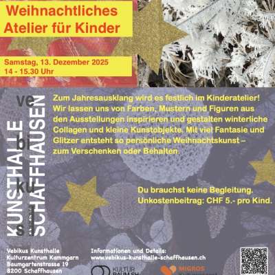 Zum Jahresausklang wird es festlich in der Vebikus Kunsthalle. Wir lassen uns von Farben, Mustern und Figuren aus den Ausstellungen inspirieren und gestalten winterliche Collagen und kleine Kunstobjekte. Mit viel Fantasie und Glitzer entsteht so persönliche Weihnachtskunst - zum Verschenken oder Behalten.