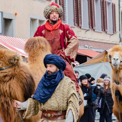 Die traditionelle Eröffnung des Weihnachtsmarktes erfolgt mit dem Einzug der Kamelkarawane. Am Freitag, 19. Dezember, um 14 Uhr startet die bunte Karawane beim Soldatendenkmal. Die Heiligen Drei Könige reiten auf echten Kamelen durch den Weihnachtsmarkt und werden dabei musikalisch von der Oberstufe der Schule Auen begleitet. Vorne mit dabei ist auch immer Eselin Cora. Am Samstag um 11 Uhr ziehen die Heiligen Drei Könige erneut durch den Weihnachtsmarkt.