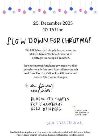 Slow down for Christmas. Fühl dich herzlich eingeladen, an unserem kleinen feinen Weihnachtsmarkt in Festtagsstimmung zu kommen. In charmantem Ambiente erwarten wir dich gemeinsam mit famosen Ausstellern von nah und fern. Entdecke Handgemachtes von Schmuck über Textil und Keramik, geschnitztes aus Holz, Kosmetik und Blumiges bis hin zu allerlei Papierschätzen. Und im Kafi locken Glühwein und andere feine Versuchungen.