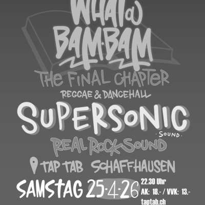 Unsere hauseigene Reggae- und Dancehall-Reihe, die WHAT A BAM BAM, ruft zum letzten Tanz. Nach über zwanzig Jahren beenden die Gastgeber von REAL ROCK SOUND dieses Kapitel und gönnen sich und euch dazu nochmals einen grossen Gast: SUPERSONIC SOUND aus Berlin! Selecta Panza und MC Spider von Supersonic beehren uns nach langer Abwesenheit mal wieder, im Gepäck haben sie eine tanzbare Mischung aus Reggae und Dancehall, nicht fehlen dürfen dabei auch ihre exklusiven Dubplates. Aktiv seit 1998, sind Supersonic Sound eine feste Grösse im internationalen Club- und Soundclash-Circuit und ausserdem auch bekannt für ihre eigenen Produktionen, Mixes und Panzas Sendungen bei “Nice Up Radio”.