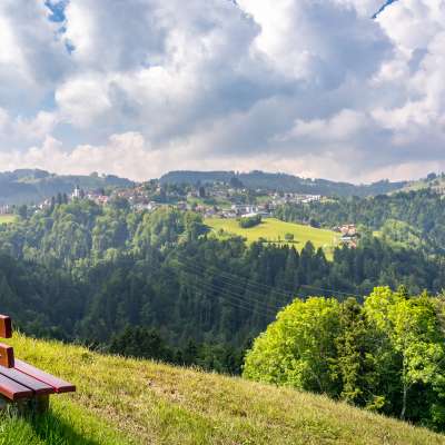 Velofahrer aufgepasst: auf dem Veloweg in Rehetobel erwartet einen eine rasante Abfahrt mit traumhaften Ausblicken. Die Lobenschwendistrasse hinab tut sich die Aussicht auf St.Galler und Appenzeller Berg- und Waldgebiete auf. Ein Bänkli lädt ein, die Momente während einer Verschnaufpause zu geniesse.