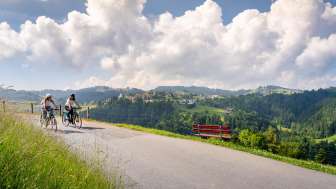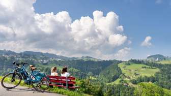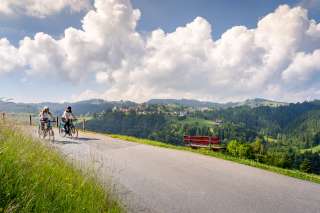 Vom Aussichtspunkt Rehetobel geniessen Velofahrer und Spaziergänger einen fantastischen Ausblick auf St.Galler und Appenzeller Berg- und Waldgebiete.