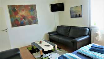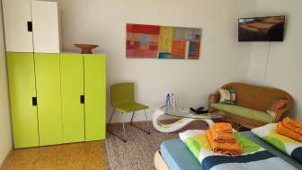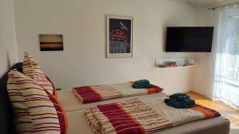 Vier moderne, grosse Doppelzimmer sind mit King-Size-Betten (alle 180 cm Breite), Schrank, einer kleinen Sitzgruppe und TV ausgestattet. Alle Räume haben Insektenschutzgitter und Verdunkelungsrollladen. WLAN steht gratis zur Verfügung. Die zwei Badezimmer, 1x mit Regendusche/WC und 1x mit Badewanne/Regendusche/WC, werden gemeinsam benützt.