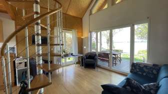 Das Badehaus ist unterteilt in zwei Etagen. Die obere Etage wird mit zwei Betten (Doppel- und Einzelbett) zum Schlafen genutzt, die untere Etage verfügt über ein Bad mit Dusche und WC.
