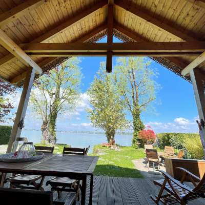 Eine grosszügige überdachte Terrasse passt perfekt in das Flair des Badehäuschens. In den See gelangen die Gäste direkt vom eigenen Wasserzugang aus.