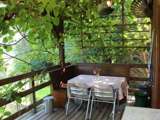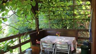 Die gedeckte Veranda bietet eine wunderbare Aussicht auf die Flusslandschaft Sittertal. Auf der Veranda befinden sich Eckbank und Tisch, um bei schönem Wetter zu Verweilen. Der Holzkohlengrill kann auch benutzt werden.