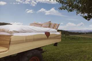Der Einachser mit aufgebautem Doppelbett kann in lauen Sommernächten unter dem Lieblings-Apfelbaum auf dem Hagschnurer Hof in Hüttwilen geparkt werden. An diesem aussergewöhnlichen Freiluft-Standort, mit nichts als dem Apfelbaum und Sternenhimmel über sich, erlebt man die Düfte und Farben der Thurgauer Natur ungefiltert und hautnah. Auch ein leichter Regen oder unsicheres Wetter verdirbt einem dieses besondere Erlebnis nicht. Neu besteht die Möglichkeit ganz einfach eine durchsichtige Plane über das Himmelbett zu spannen. Ebenfalls gibt es in der Schüür eine Notunterkunft für die Gäste.