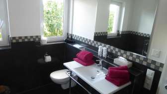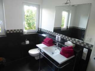 Mit einer Wohnküche, zwei Schlafzimmern, komfortablem Bad mit Dusche und Badewanne, sowie einer separaten Gäste-Toilette sind die Ferienwohnungen wohnlich geschnitten. In der Einbauküche ist ein Umluftherd, Ceran Kochfeld, Kühlschrank, Microwelle, Kaffeemaschine, Wasserkocher, sowie alle wichtigen Küchenutensilien vorhanden. Der Wohnbereich mit einem Essplatz für 4 Personen, Schlafsofa und Sat. TV führt zur Terrasse mit Gartenlounge. Die beiden Schlafzimmer sind mit einem Doppelbett und Kleiderschrank gemütlich eingerichtet.