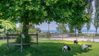 Im grossen Garten mit vielen Obstbäumen gibt es einen vielfältigen Spielplatz und Tiere laden zum Verweilen ein. Hier können Wanderer und Velofahrerinnen vom Bodenseeweg verschnaufen, im Hofladen eine regionale Köstlichkeit einkaufen und den Alltag vergessen. In einem kunterbunten Durcheinander von Spielsachen tollen die kleinen Gäste herum und bauen Sandburgen. Blökende Ziegen lieben es gestreichelt zu werden und hoppelnde Hasen warten auf einen Löwenzahn aus Kinderhand.